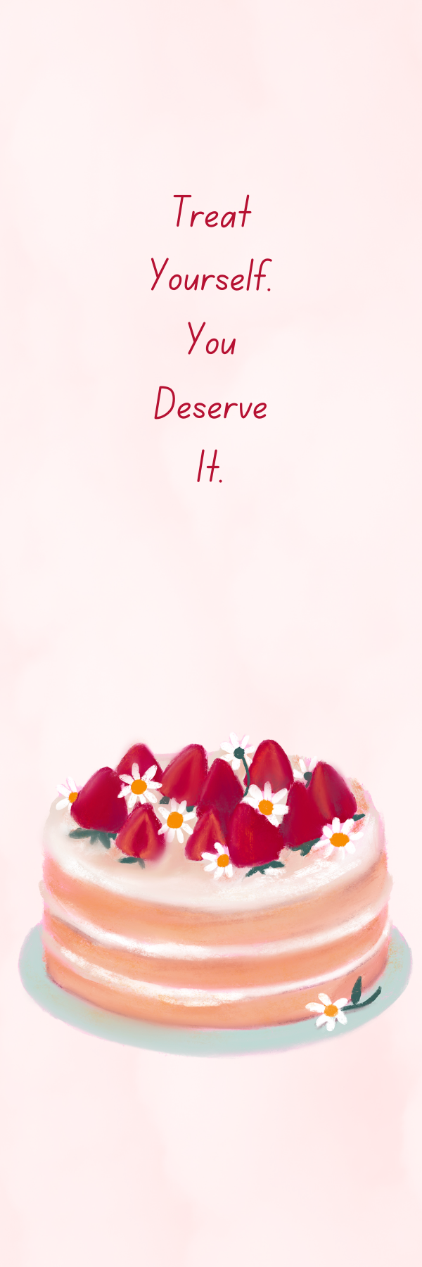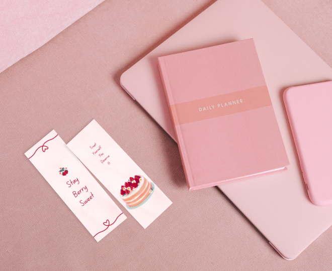 Sitting on the grass on a sunny day, reading a book, munching on strawberries. They taste sour and sweet. These bookmarks suit the vibe. The first piece has knotted hearts on top and bottom parts. Strawberries icon above the written sweet letters. The second piece has a sweet strawberry cake below the written sweet words. These quotes are correct. Stay sweet and sweetly treat yourself!
